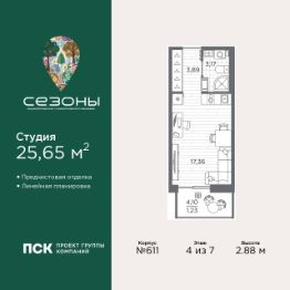 1-комн. квартира-студия с предчистовой отделкой в ЖК "Сезоны" на 4 этаже. Общая площадь: 25.65 кв.м., площадь гостиной 17.52 кв.м., из которых 5 кв.м. выделено под кухонную зону. Все окна выходят на одну сторону. В квартире один балкон, один совмещенный санузел. Высота потолков 2.88 м.