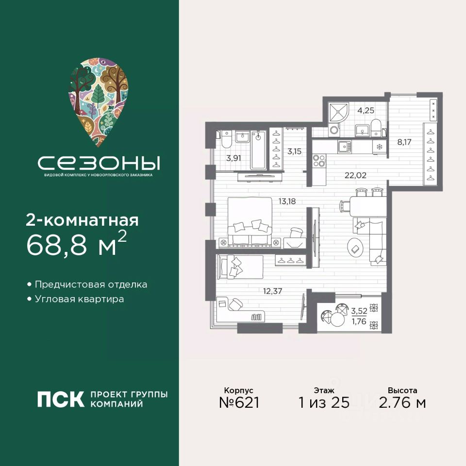 Продается двухкомнатная квартира с предчистовой отделкой в ЖК "Сезоны" на 1 этаже. Общая площадь: 68.8 кв.м., жилая: 25.55 кв.м., площадь просторной кухни-столовой: 22.02 кв.м. Угловая квартира, очень светлая, естественная вентиляция при открытии окон. В квартире одна лоджия, два совмещенных санузла. Высота потолков 2.76 м.