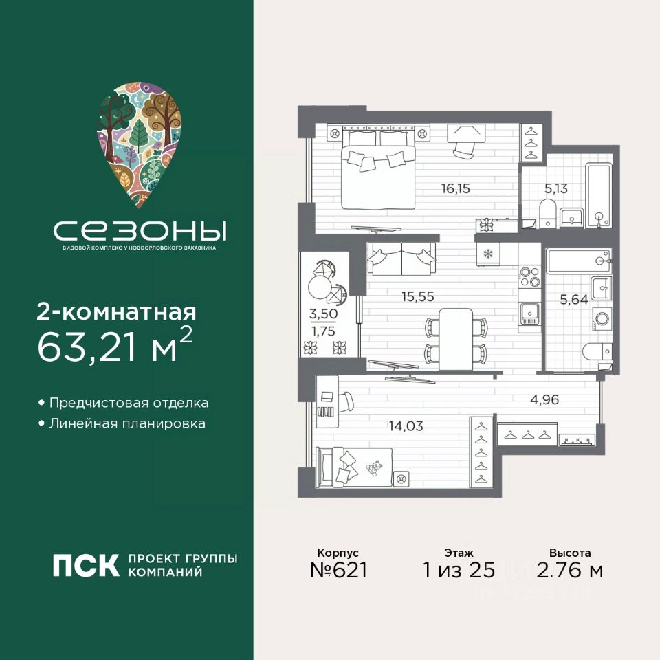 2-комн. квартира с предчистовой отделкой в ЖК "Сезоны" на 1 этаже. Общая площадь: 63.21 кв.м., жилая: 30.18 кв.м., площадь просторной кухни-столовой: 15.55 кв.м. Комнаты изолированные, все окна выходят на одну сторону. В квартире одна лоджия, два совмещенных санузла. Высота потолков 2.76 м.