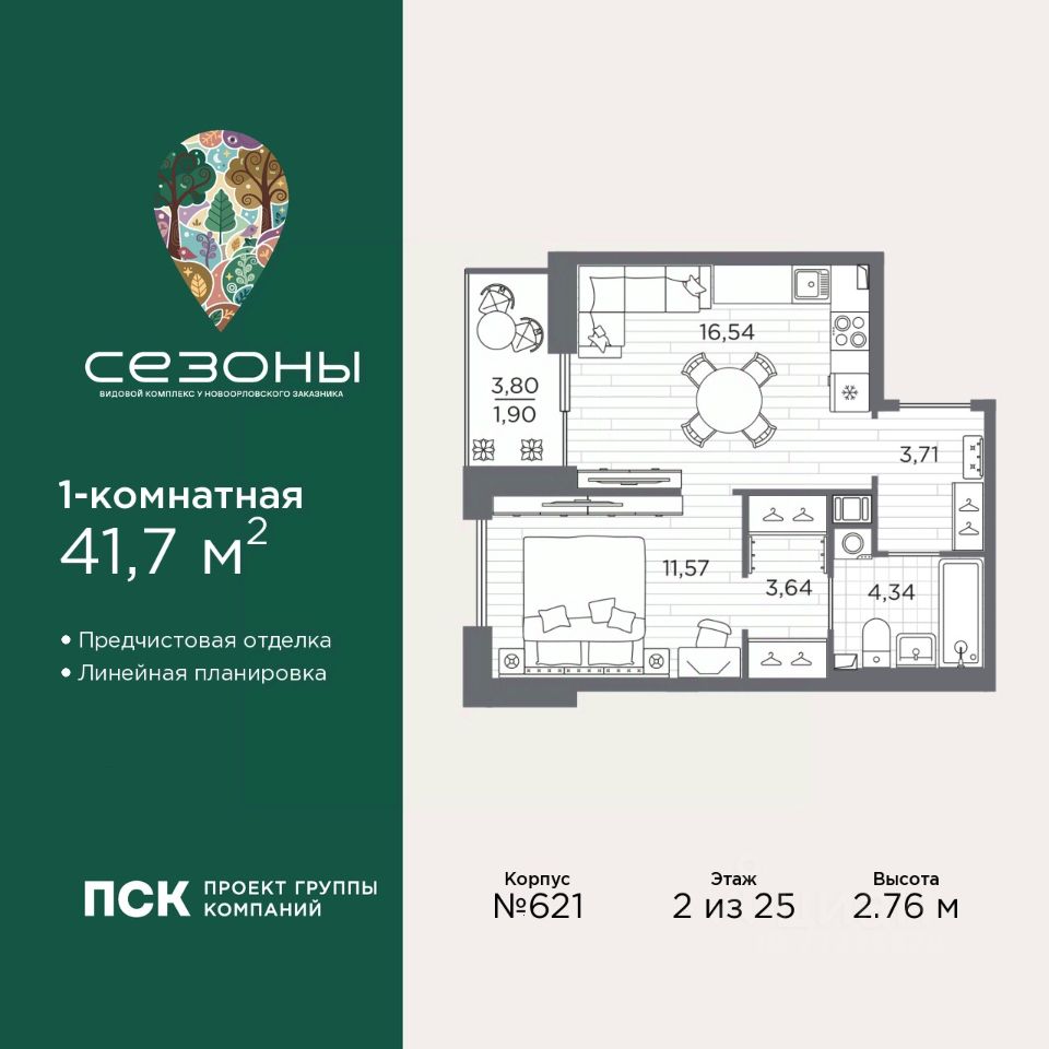 Просторная 1-комн. квартира с предчистовой отделкой в ЖК "Сезоны" на 2 этаже. Общая площадь: 41.7 кв.м., жилая: 11.57 кв.м., площадь просторной кухни-столовой: 16.54 кв.м. Все окна выходят на одну сторону. В квартире одна лоджия, один совмещенный санузел. Высота потолков 2.76 м.