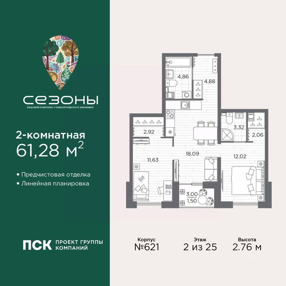 Двухкомнатная квартира с предчистовой отделкой в ЖК "Сезоны" на 2 этаже. Общая площадь: 61.28 кв.м., жилая: 23.65 кв.м., площадь просторной кухни-столовой: 18.09 кв.м. Комнаты изолированные, все окна выходят на одну сторону. В квартире одна лоджия, два совмещенных санузла. Высота потолков 2.76 м.