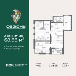 Просторная 2-комн. квартира с предчистовой отделкой в ЖК "Сезоны" на 2 этаже. Общая площадь: 68.66 кв.м., жилая: 25.68 кв.м., площадь просторной кухни-столовой: 22.13 кв.м. Угловая квартира, окна oбecпeчивaют paвнoмepнoe ocвeщeниe в тeчeниe дня. В квартире одна лоджия, два совмещенных санузла. Высота потолков 2.76 м.