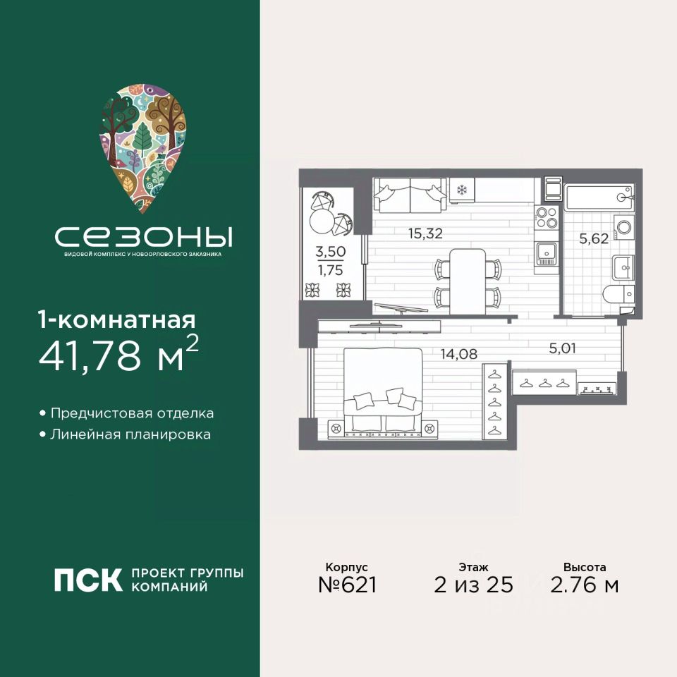 1-комн. квартира от застройщика с предчистовой отделкой в ЖК "Сезоны" на 2 этаже. Общая площадь: 41.78 кв.м., жилая: 14.08 кв.м., площадь просторной кухни-столовой: 15.32 кв.м. Все окна выходят на одну сторону. В квартире одна лоджия, один совмещенный санузел. Высота потолков 2.76 м.