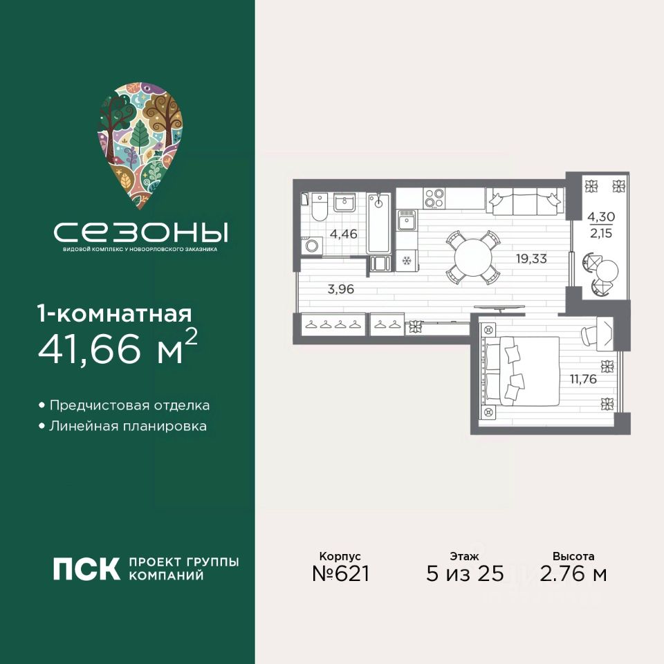 Просторная 1-комн. квартира с предчистовой отделкой в ЖК "Сезоны" на 5 этаже. Общая площадь: 41.66 кв.м., жилая: 11.76 кв.м., площадь просторной кухни-столовой: 19.33 кв.м. Все окна выходят на одну сторону. В квартире одна лоджия, один совмещенный санузел. Высота потолков 2.76 м.