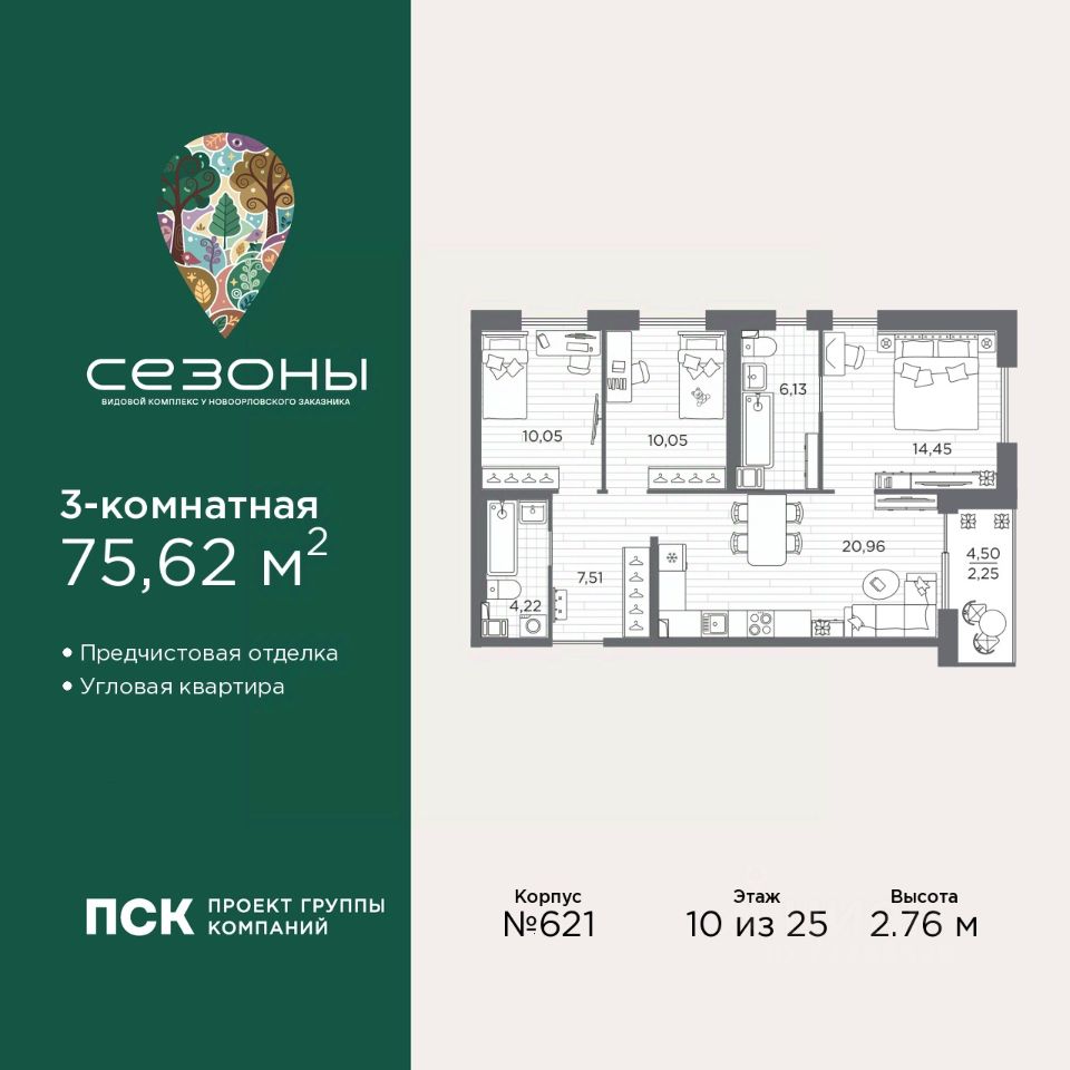 3-комн. квартира от застройщика с предчистовой отделкой в ЖК "Сезоны" на 10 этаже. Общая площадь: 75.62 кв.м., жилая: 34.47 кв.м., площадь просторной кухни-столовой: 20.89 кв.м. Квартира угловая, идеально подойдет любителям тишины и панорамных видов. В квартире одна лоджия, два совмещенных санузла. Высота потолков 2.76 м.