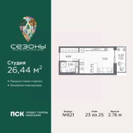 1-комн. квартира-студия с предчистовой отделкой в ЖК "Сезоны" на 23 этаже. Общая площадь: 26.44 кв.м., площадь гостиной 17.1 кв.м., из которых 5 кв.м. выделено под кухонную зону. Все окна выходят на одну сторону. В квартире один балкон, один совмещенный санузел. Высота потолков 2.76 м.