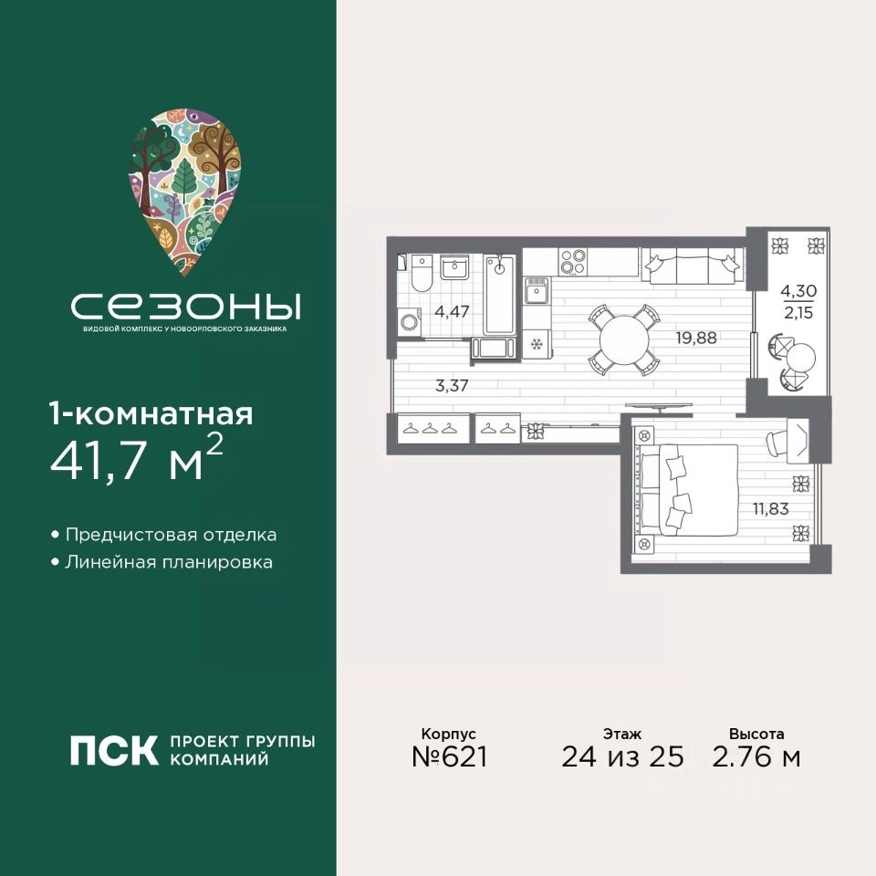 1-комн. квартира с предчистовой отделкой в ЖК "Сезоны" на 24 этаже. Общая площадь: 41.7 кв.м., жилая: 11.57 кв.м., площадь просторной кухни-столовой: 16.54 кв.м. Все окна выходят на одну сторону. В квартире одна лоджия, один совмещенный санузел. Высота потолков 2.76 м.