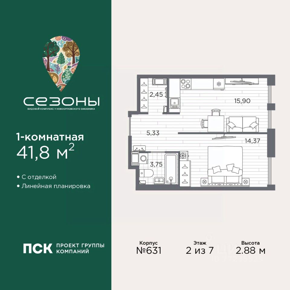 1-комн. квартира от застройщика с отделкой в ЖК "Сезоны" на 2 этаже. Общая площадь: 41.8 кв.м., жилая: 14.37 кв.м., площадь просторной кухни-столовой: 15.9 кв.м. Все окна выходят на одну сторону. В квартире один совмещенный санузел. Высота потолков 2.88 м.