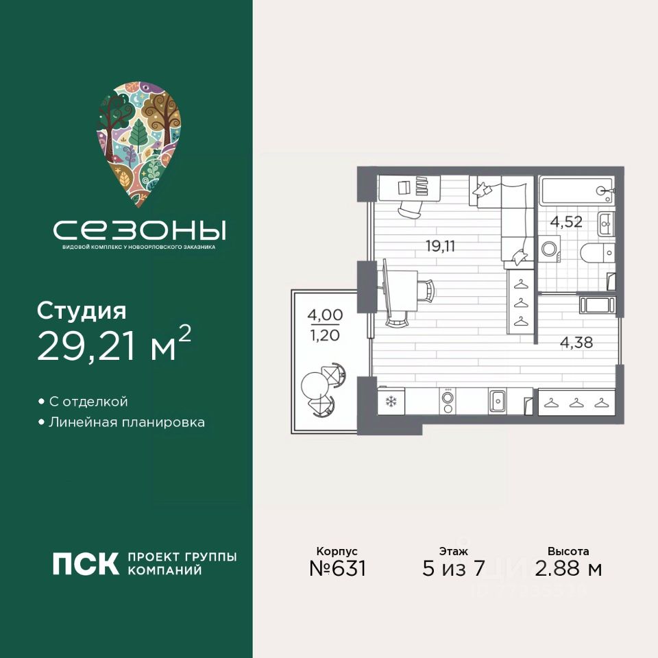 Однокомнатная квартира-студия от застройщика с отделкой в ЖК "Сезоны" на 5 этаже. Общая площадь: 29.21 кв.м., площадь гостиной 19.11 кв.м., из которых 5 кв.м. выделено под кухонную зону. Все окна выходят на одну сторону. В квартире один балкон, один совмещенный санузел. Высота потолков 2.88 м.