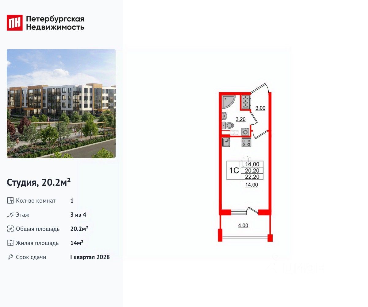 Удобная, классическая, функциональная европланировка, вместительная прихожая 3 м². Общая площадь студии - 20.2 м², жилая 14 м², высота потолка 2.78 м.