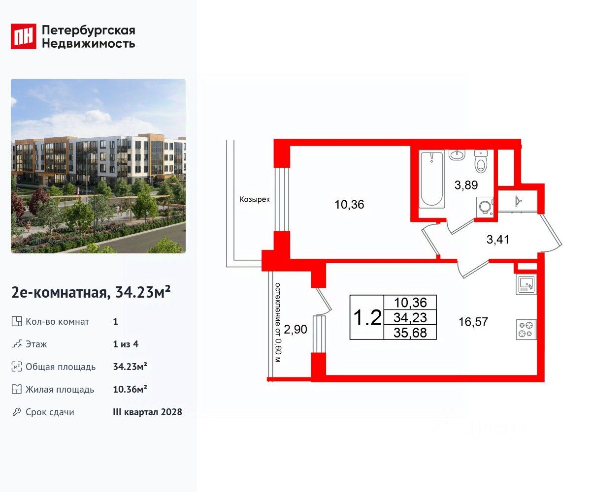Удобная, классическая, функциональная европланировка, большая кухня-гостиная 16.57 м², вместительная прихожая 3.41 м². Общая площадь квартиры - 34.23 м², жилая 10.36 м², высота потолка 2.77 м.