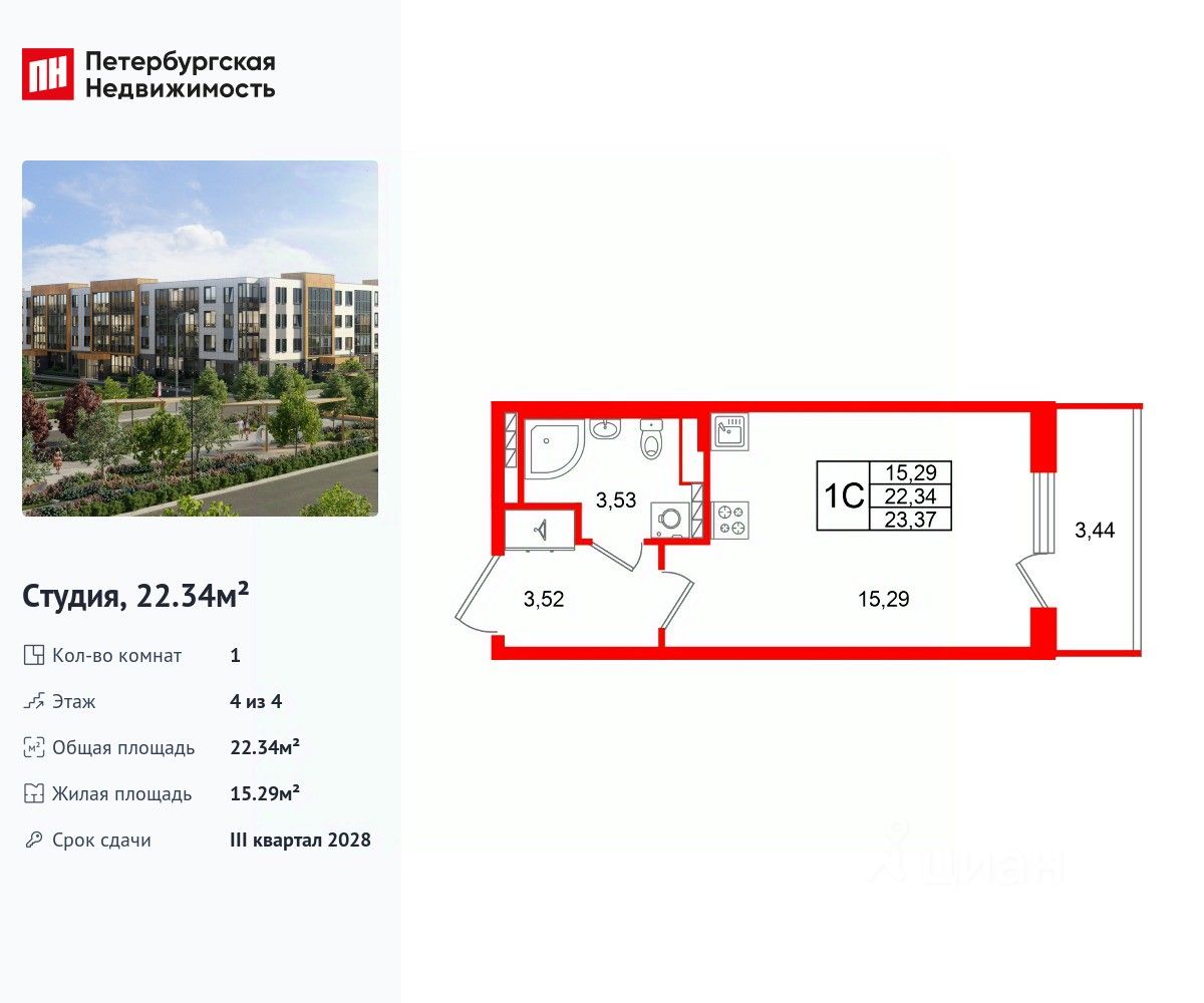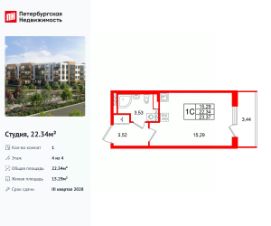 Удобная, классическая, функциональная европланировка, просторная прихожая 3.52 м². Общая площадь студии - 22.34 м², жилая 15.29 м², высота потолка 3.07 м.