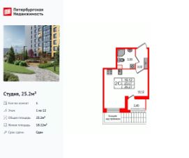 Удобная, классическая, функциональная европланировка, вместительная прихожая 3.02 м². Общая площадь студии - 25.2 м², жилая 18.12 м², высота потолка 2.77 м.
