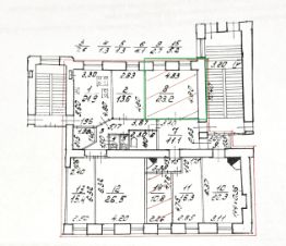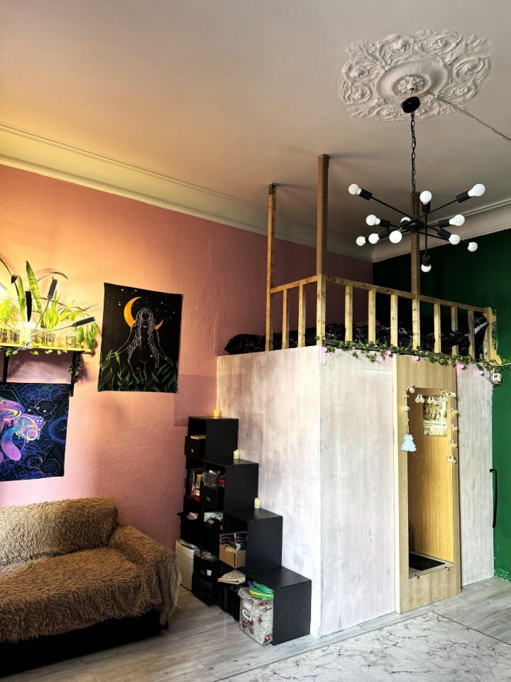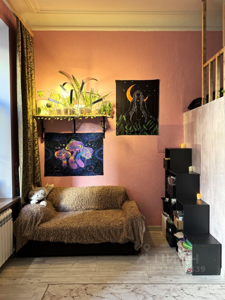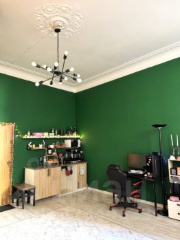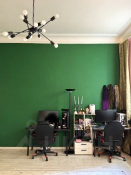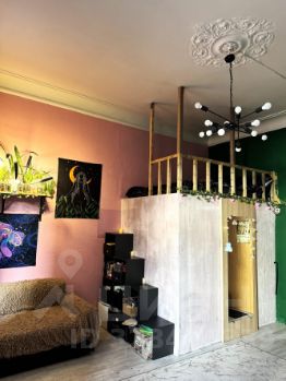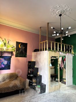 Комната общей площадью 23.2 кв.м находится на втором этаже, в 7-комнатной коммунальной квартире (заселённых, жилых комнат — 6, проживают преимущественно собственники). Удачное расположение комнаты в квартире, ни с одной стороны нет соседей (в комнате по смежной стене отсутствуют жильцы). В комнате выполнен полный капитальный и косметический ремонт, сохранена лепнина розетки и окантовочного бортика на потолке. Пространство использовано эргономично: спальная зона оборудована вторым ярусом (высота потолка в квартире — 3.5 м), под ней выгорожена полноценная закрывающаяся гардеробная, а по одной из стен установлена мини-кухня (без мокрой точки, неузаконенных перепланировок и переноса коммуникаций нет).