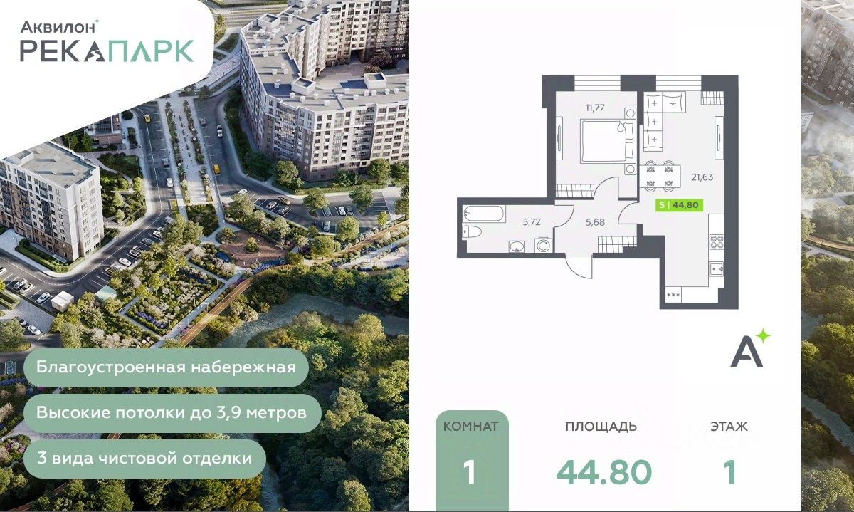 1-комн. квартира от застройщика в ЖК "Аквилон РекаПарк" на 1 этаже. Общая площадь: 44.8 кв.м., жилая: 11.77 кв.м., площадь просторной кухни-столовой: 21.63 кв.м. Все окна выходят на одну сторону. В квартире один совмещенный санузел. Высота потолков 2.74 м.