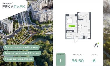 1-комн. квартира в ЖК "Аквилон РекаПарк" на 6 этаже. Общая площадь: 36.5 кв.м., жилая: 11.31 кв.м., площадь просторной кухни-столовой: 14.09 кв.м. Все окна выходят на одну сторону. В квартире одна лоджия, один совмещенный санузел. Высота потолков 2.74 м.