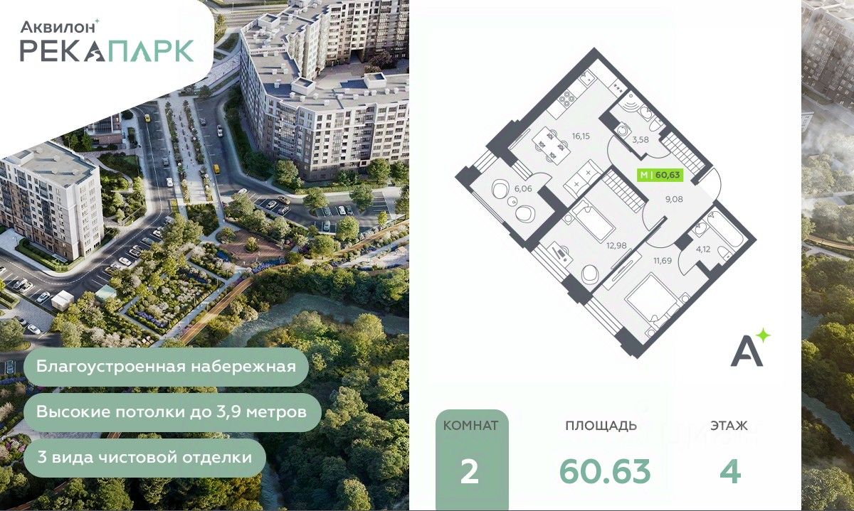 Двухкомнатная квартира в ЖК "Аквилон РекаПарк" на 4 этаже. Общая площадь: 60.63 кв.м., жилая: 24.67 кв.м., площадь просторной кухни-столовой: 16.15 кв.м. Комнаты изолированные, все окна выходят на одну сторону. В квартире одна лоджия, два совмещенных санузла. Высота потолков 2.74 м.
