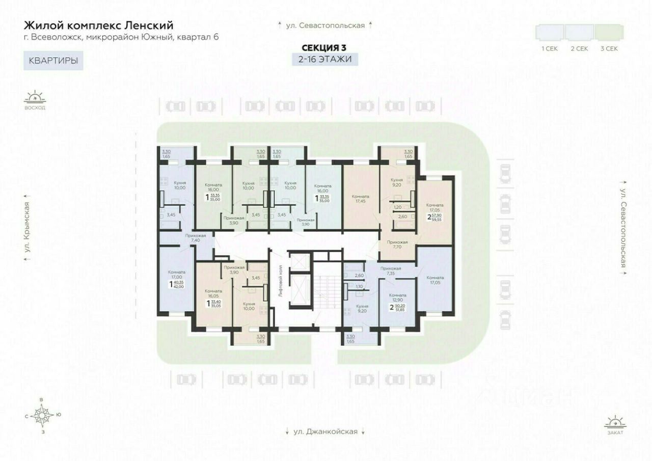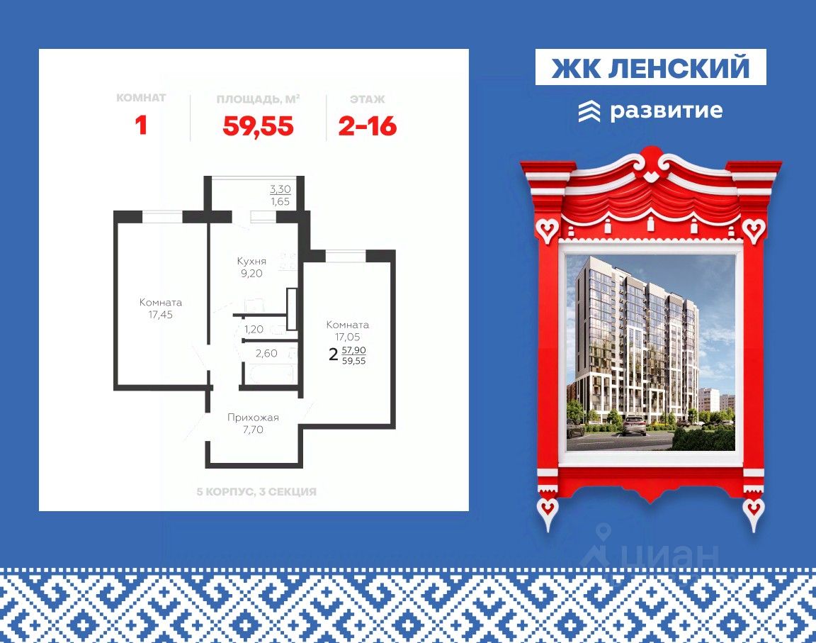 Продается 2-комнатная квартира 59,55 кв.м. на 13 этаже. В продаже квартира в жилом комплексе комфорт-класса "Ленский".