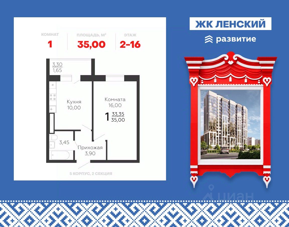 Продается 1-комнатная квартира 35 кв.м. на 10 этаже. В продаже квартира в жилом комплексе комфорт-класса "Ленский".