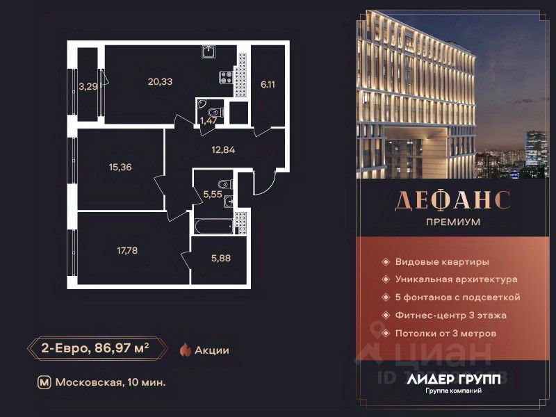 ЖК "Дефанс Премиум". Строительство завершено. Дом получил заключение о соответствии и готовится к вводу! Это проект авторской архитектуры с уникальными форматами квартир в 10 минутах ходьбы от станции метро "Московская". Дом выполнен в виде двух 23-х этажных арок, основания которых объединены единым внутренним пространством с большой парадной лестницей, променадом и большим фонтанным комплексом с подсветкой. В составе проекта построен большой фитнес-центр с бассейнами и зоной СПА. Часть квартир отделена от остальных жилых этажей специальным техническим этажом — это снимает все ограничения по перепланировке. Для части квартир предусмотрены индивидуальные входные группы и дополнительные лифты премиального немецкого бренда Tyssen Krupp (TKE). Фасады, облицованные испанской керамикой и алюминиевые панорамные окна с энергоэффективными стеклами AGС Energy подчеркивают высокий статус дома. На квартиры ЗПИФ и переуступки семейная ипотека не распространяется!