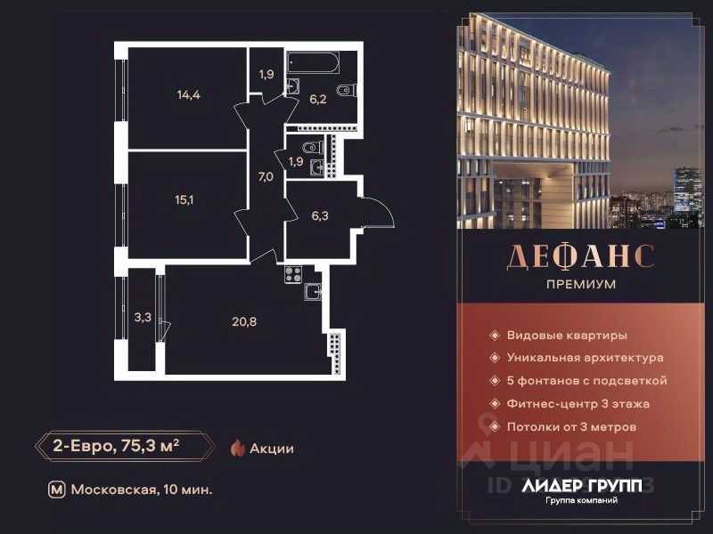 ЖК "Дефанс Премиум". Строительство завершено. Дом получил заключение о соответствии и готовится к вводу! Это проект авторской архитектуры с уникальными форматами квартир в 10 минутах ходьбы от станции метро "Московская". Дом выполнен в виде двух 23-х этажных арок, основания которых объединены единым внутренним пространством с большой парадной лестницей, променадом и большим фонтанным комплексом с подсветкой. В составе проекта построен большой фитнес-центр с бассейнами и зоной СПА. Часть квартир отделена от остальных жилых этажей специальным техническим этажом — это снимает все ограничения по перепланировке. Для части квартир предусмотрены индивидуальные входные группы и дополнительные лифты премиального немецкого бренда Tyssen Krupp (TKE). Фасады, облицованные испанской керамикой и алюминиевые панорамные окна с энергоэффективными стеклами AGС Energy подчеркивают высокий статус дома. На квартиры ЗПИФ и переуступки семейная ипотека не распространяется!