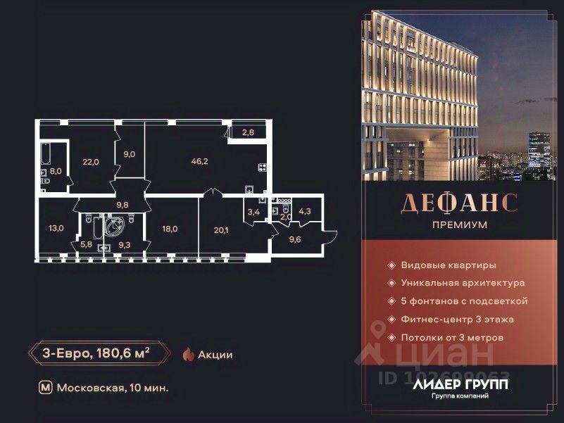 ЖК "Дефанс Премиум". Строительство завершено. Дом получил заключение о соответствии и готовится к вводу! Это проект авторской архитектуры с уникальными форматами квартир в 10 минутах ходьбы от станции метро "Московская". Дом выполнен в виде двух 23-х этажных арок, основания которых объединены единым внутренним пространством с большой парадной лестницей, променадом и большим фонтанным комплексом с подсветкой. В составе проекта построен большой фитнес-центр с бассейнами и зоной СПА. Часть квартир отделена от остальных жилых этажей специальным техническим этажом — это снимает все ограничения по перепланировке. Для части квартир предусмотрены индивидуальные входные группы и дополнительные лифты премиального немецкого бренда Tyssen Krupp (TKE). Фасады, облицованные испанской керамикой и алюминиевые панорамные окна с энергоэффективными стеклами AGС Energy подчеркивают высокий статус дома. На квартиры ЗПИФ и переуступки семейная ипотека не распространяется!