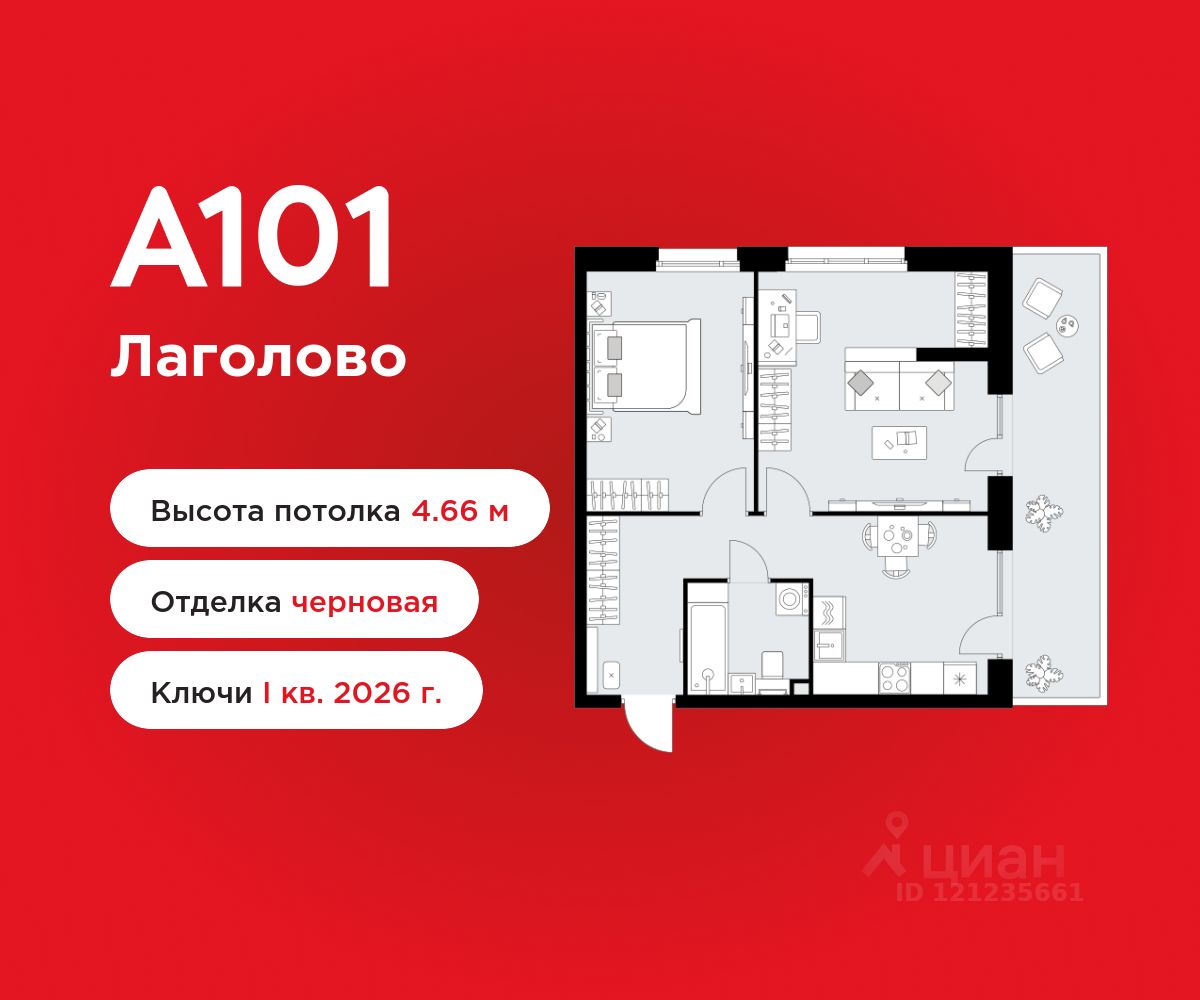 2-комнатная квартира площадью 59.30 в ЖК "А101 Лаголово" на 1 этаже. Квартира без отделки. Вид из окна во двор. В квартире 1 санузел. Высота потолков 4.66 м.