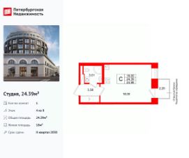Удобная, классическая, функциональная европланировка, просторная прихожая 3.38 м². Общая площадь студии - 24.39 м², жилая 18 м², высота потолка 2.72 м.