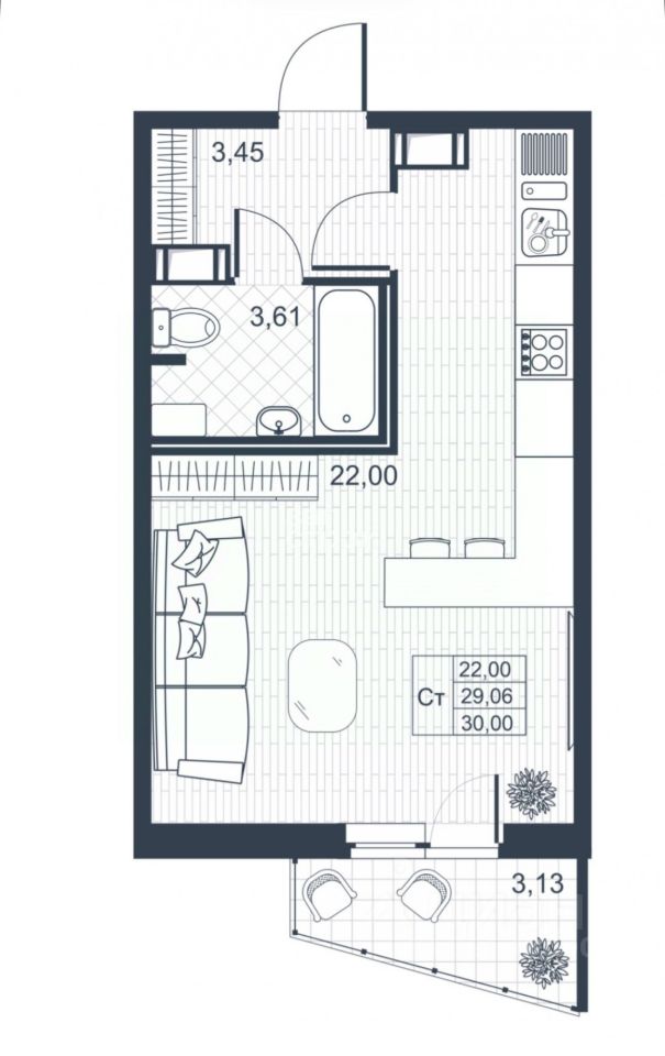 О КВАРТИРЕ: Квартира-студия с натяжными потолками, общей площадью 28,8м², жилая площадь 22м², прихожая - 3,45м², санузел - 3,61м²