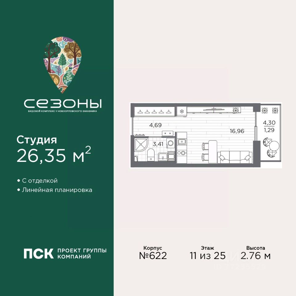 Просторная 1-комн. квартира-студия с отделкой в ЖК "Сезоны" на 11 этаже. Общая площадь: 26.35 кв.м., площадь гостиной 16.96 кв.м., из которых 5 кв.м. выделено под кухонную зону. Все окна выходят на одну сторону. В квартире один балкон, один совмещенный санузел. Высота потолков 2.76 м.