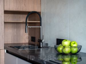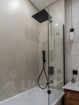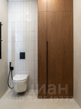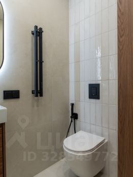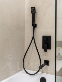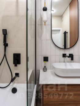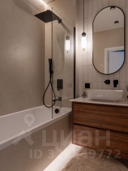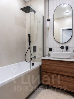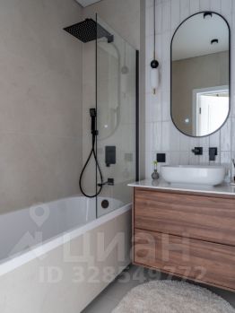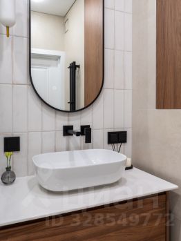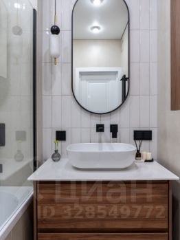 -В ванной комнате расположена полноценная ванна, сантехника скрытого монтажа, широкая тумба, и накладная раковина. Над раковиной лаконичное овальное зеркало с подсветкой. Также расположен удобный шкаф, за которым установлена коллекторная разводка водоснабжения, с датчиками протечки и датчиками защиты от гидроудара, а также фильтры очистки воды. Предусмотрено место для установки водонагревателя.