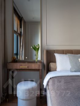 У окна расположен туалетный столик и большое зеркало с подсветкой. На окнах такие же красивые жалюзи из дерева, как в гостиной.