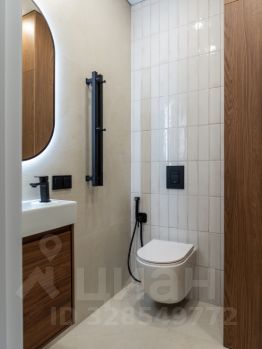 -В туалетной комнате установлена качественная инсталляция, гиг. душ, раковина с подвесной тумбой и зеркало с подсветкой.