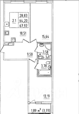 Площадь квартиры с балконом - 67 кв.м.