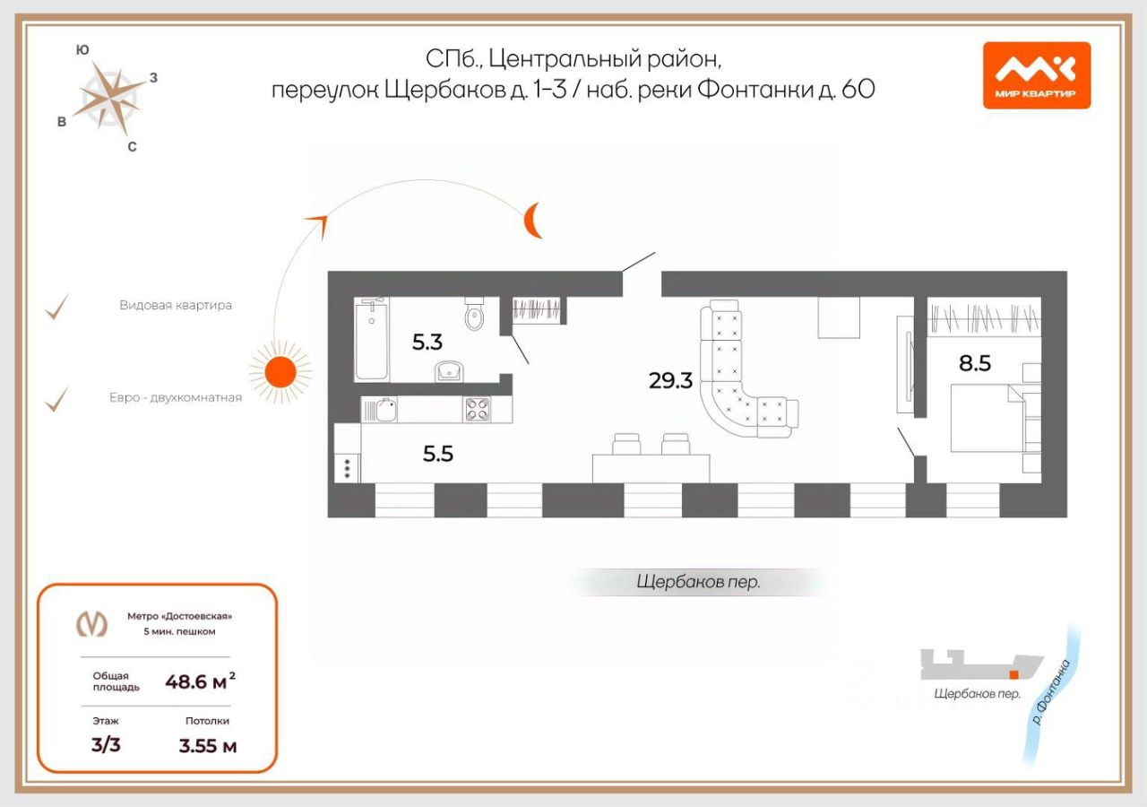 Квартира расположена в угловом доме на Фонтанке и Щербаковом переулке на третьем этаже в доме с капитальным ремонтом. Вход с камерного закрытого двора. Чистый подъезд после ремонта. Без лифта.
