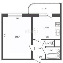 Квартира имеет удобную функциональную планировку. Большая светлая комната правильной прямоугольной формы 17.9 кв. м, квадратная кухня 9.0 кв. м с выходом на остекленный просторный балкон 4.1 кв.м., являющийся дополнительной зоной отдыха. Из окон открывается вид на солнечную сторону с пейзажными перспективами. Раздельный санузел обеспечивает удобство пользования.