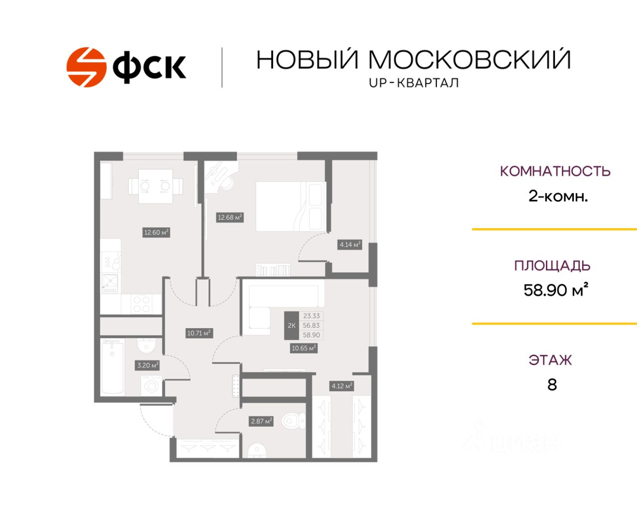 Прямая продажа от застройщика. Беспроцентная рассрочка. 2-к квартира в ЖК Квартал "Новый Московский" на 8-м этаже. Общая площадь 59,3. Без отделки.