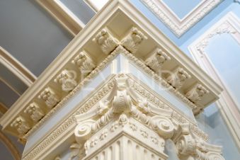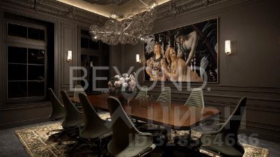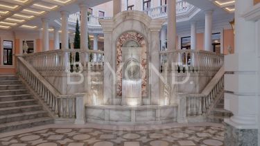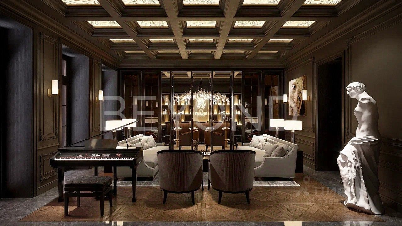 Интерьеры квартиры были оформлены по проекту архитектора Ван-дер-Гюхта и сохранили отделку в стиле эклектики. Применение лепного декора, скульптура, старинные изразцовые печи - всё напоминает о богатом историческом прошлом. Функционал квартиры включает в себя гостиную 59,47 кв. м, большой кабинет с камином, столовую, кухню и три спальни с собственными ванными комнатами, одна из них - мастер-спальня 54,4 кв. м со своей гардеробной и ванной комнатой, и с полукруглым эркером, откуда открываются панорамные виды на Неву и Таврический сад. В квартире запроектированы два входа: парадный и сервисный, а также хозяйственные помещения.