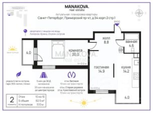 Квартира 65 кв.м. в доме Бизнес-класса Лайф Приморский. Закрытая охраняемая территория с выходом к воде на прогулочную зону и велосипедные дорожки вдоль воды, по которой можно пойти влево до Елагина острова или вправо до парка 300-летия мимо зон отдыха и пляжей.