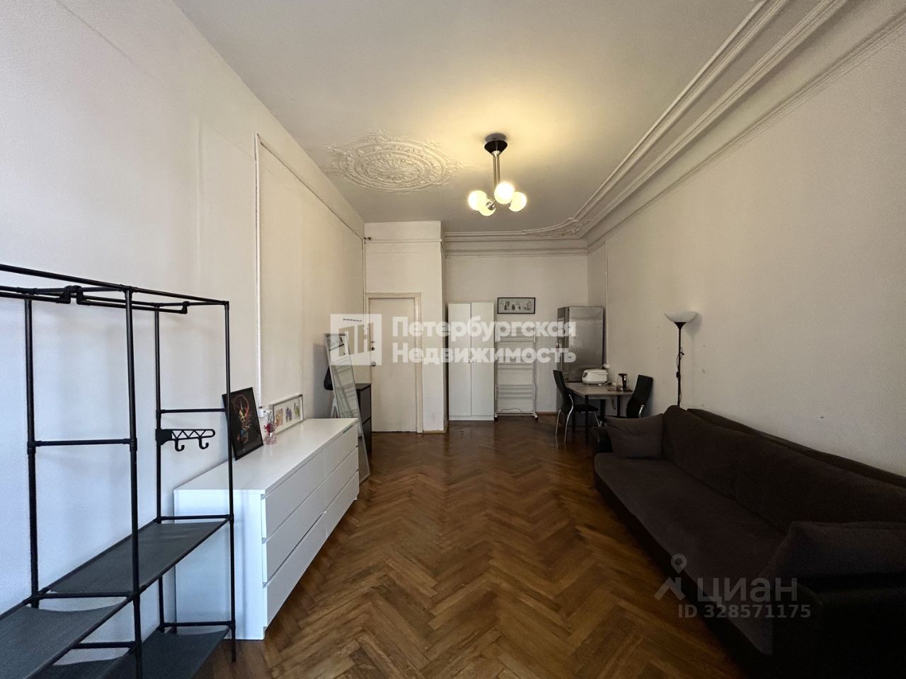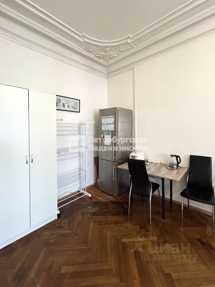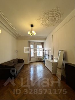 Большая светлая гостиная с эркером и лепниной на потолке. На окнах сохранились шпингалеты можно отреставрировать и сохранить дух доходного дома. Отдельная выделенная часть под спальню. Окна в комнате смотрят на тихую улицу, в дневные часы комната наполнена светом.