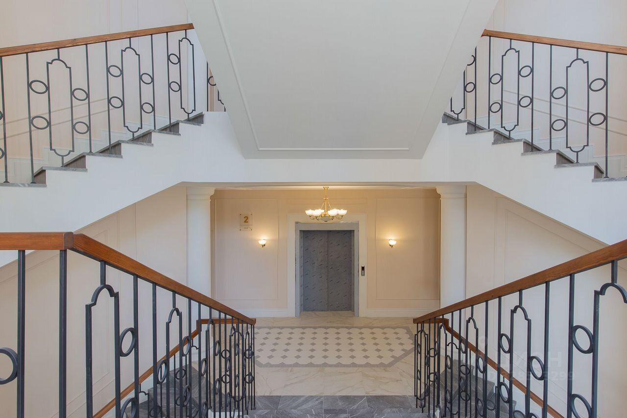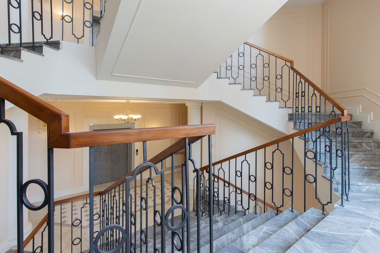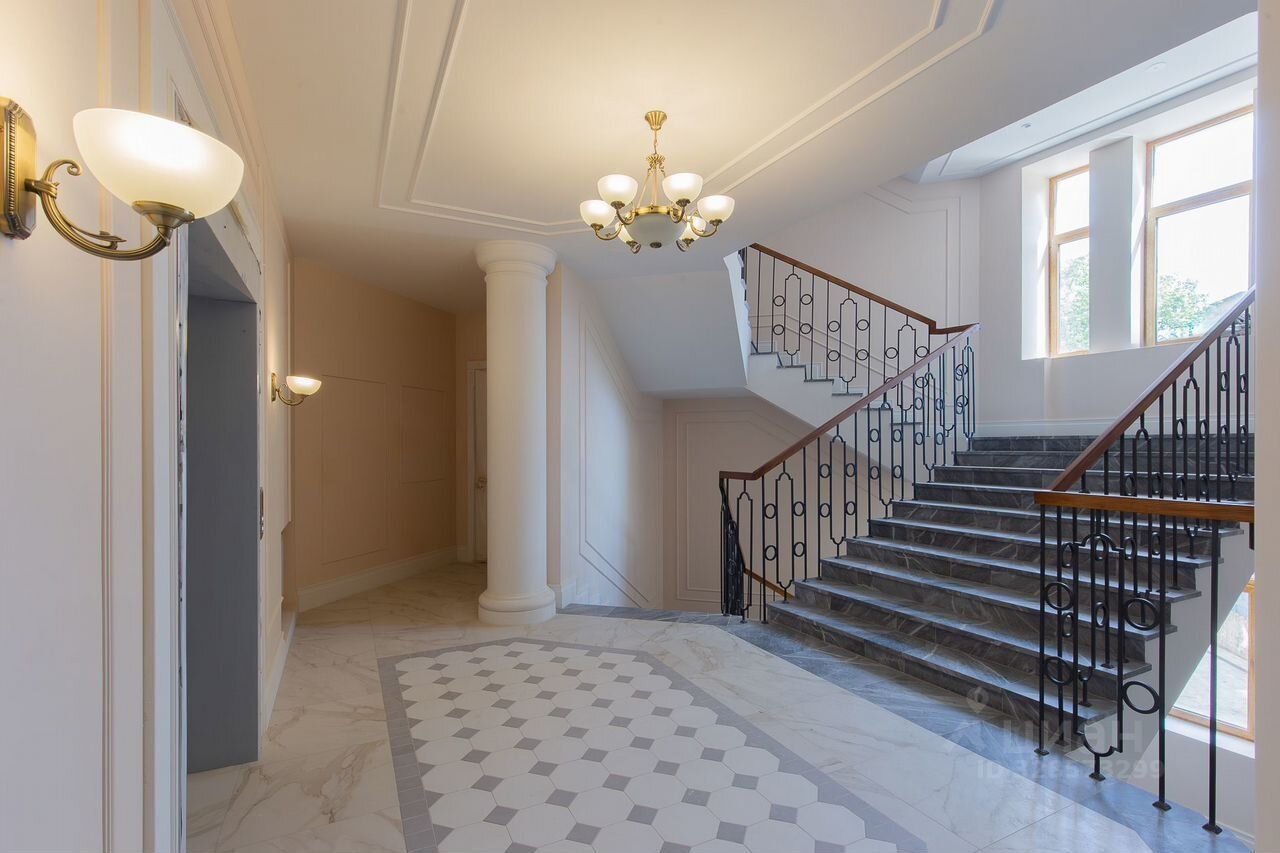 На первом этаже — просторное лобби с ресепшеном, выполненным в неоклассическом стиле. Полы — керамогранит, стены — штукатурка и зеркала, лестница — деревянная с изысканными перилами. Всё это создаёт атмосферу истинного элитного жилья.