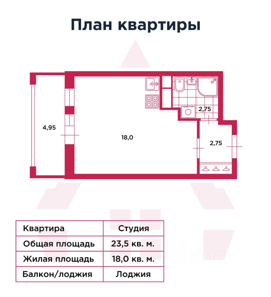 • Общая площадь 23,5 м² + лоджия 4,95 м² — отличное дополнение к площади квартиры, где можно оборудовать кабинет или зону отдыха