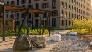 Закрытые дворы комплекса превращены в уютные прогулочные зоны для детей и взрослых. Застройщик выполнил озеленение пространства, согласно авторскому проекту ландшафтного дизайна, проложил велодорожки и тротуары, организовал закрытую набережную, установил многофункциональные спортивно-игровые городки, беседки, лавочки и стойки для велосипедов.