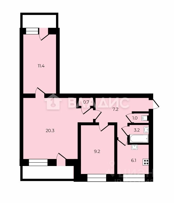 Общая площадь составляет 61,1 кв. м, из которых 40,9 кв. м — жилая площадь. Высота потолков — 2,6 м, что создаёт ощущение простора. Комнаты 20,3+11,4+9,2 кв.м. Кухня- 6,1 кв.м.