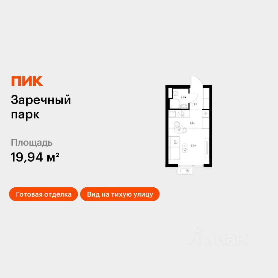 Продаётся квартира-студия площадью 19,94 кв.м на 8 этаже 16 этажного дома (Корпус 4, Секция 2) проекта ПИК Заречный парк. Светлый просторный подъезд на уровне земли, функциональная планировка, большие окна, c отделкой.