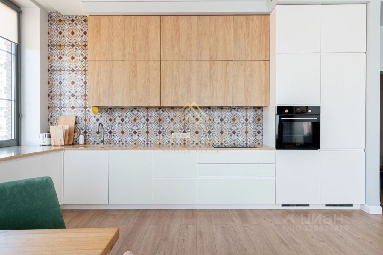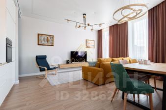 Кухня-гостиная: Сердце дома 32 кв.м эркерного пространства с шестью (!) окнами в пол (высота потолков 3,3 метра) открывает потрясающие виды и наполняет квартиру светом. Кухня, выполненная по индивидуальному проекту, оснащена выдвижными ящиками, литой столешницей из искусственного камня и всей необходимой техникой.
