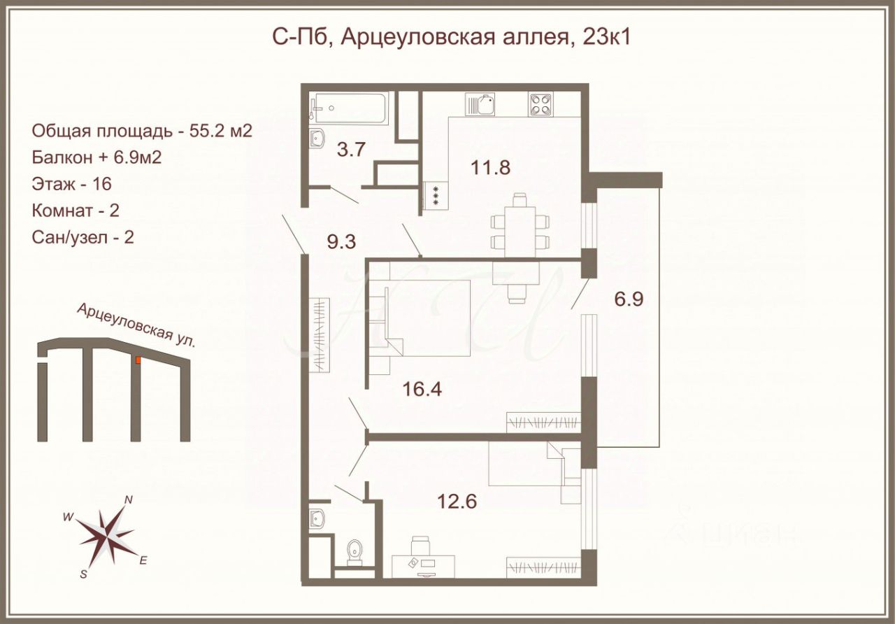 Арт. 134010341 Светлая уютная квартира для небольшой семьи расположена на 16 этаже в ЖК "Чистое Небо" Общая площадь 55,2 м2, планировка включает просторную кухню и 2 спальни. Большая лоджия 6,9 м2 дает дополнительные пространство и зоны хранения. Окна выходят на восточную сторону. Квартира продается с отделкой и мебелью.
