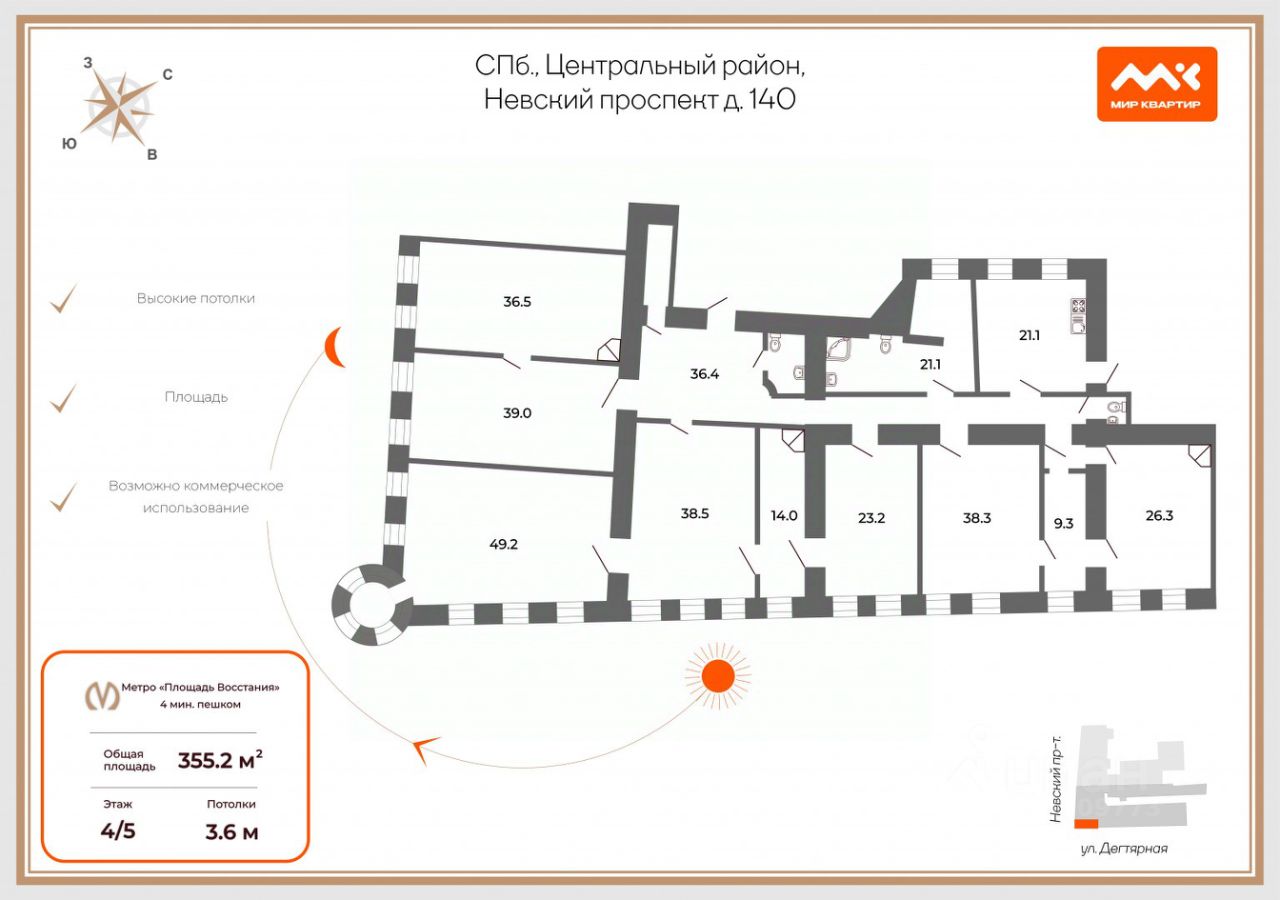 Всё, чем характеризуется образцовый старый фонд здесь есть - красивая парадная с Невского проспекта, по 2 квартиры на этаже, функциональная планировка с кучей окон и высокими потолками, ну и, еще раз - шикарная локация. Минимальное количество несущих стен, 2 входа, несколько санузлов и количество окон буквально снимают любые ограничения для организации пространства. Огромная кухня гостиная с печью и эркером, 3,4,5, а может и больше спален, кабинет и игровая? - нет проблем! 355 метров - места хватит для всего!