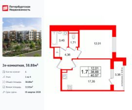 Удобная, классическая, функциональная европланировка, большая кухня-гостиная 17.35 м², просторная прихожая 4.36 м². Общая площадь квартиры - 38.88 м², жилая 12.01 м², высота потолка 2.77 м.