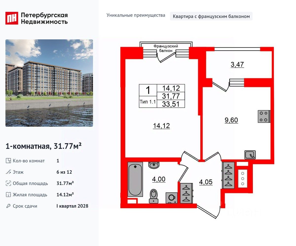 Уникальная планировка, кухня 9.6 м², вместительная прихожая 4.05 м². Общая площадь квартиры - 31.77 м², жилая 14.12 м², высота потолка 2.77 м.